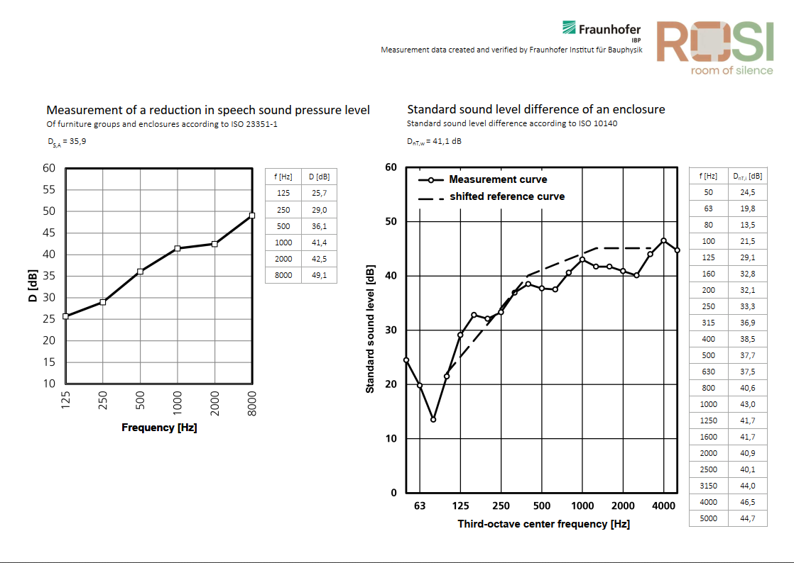 Here you will find all the measured values for the classic STUDIOBOXes. The reverberation time of the ROSI biological soundproof booth corresponds, with minor deviations, to that of the PREMIUM model.