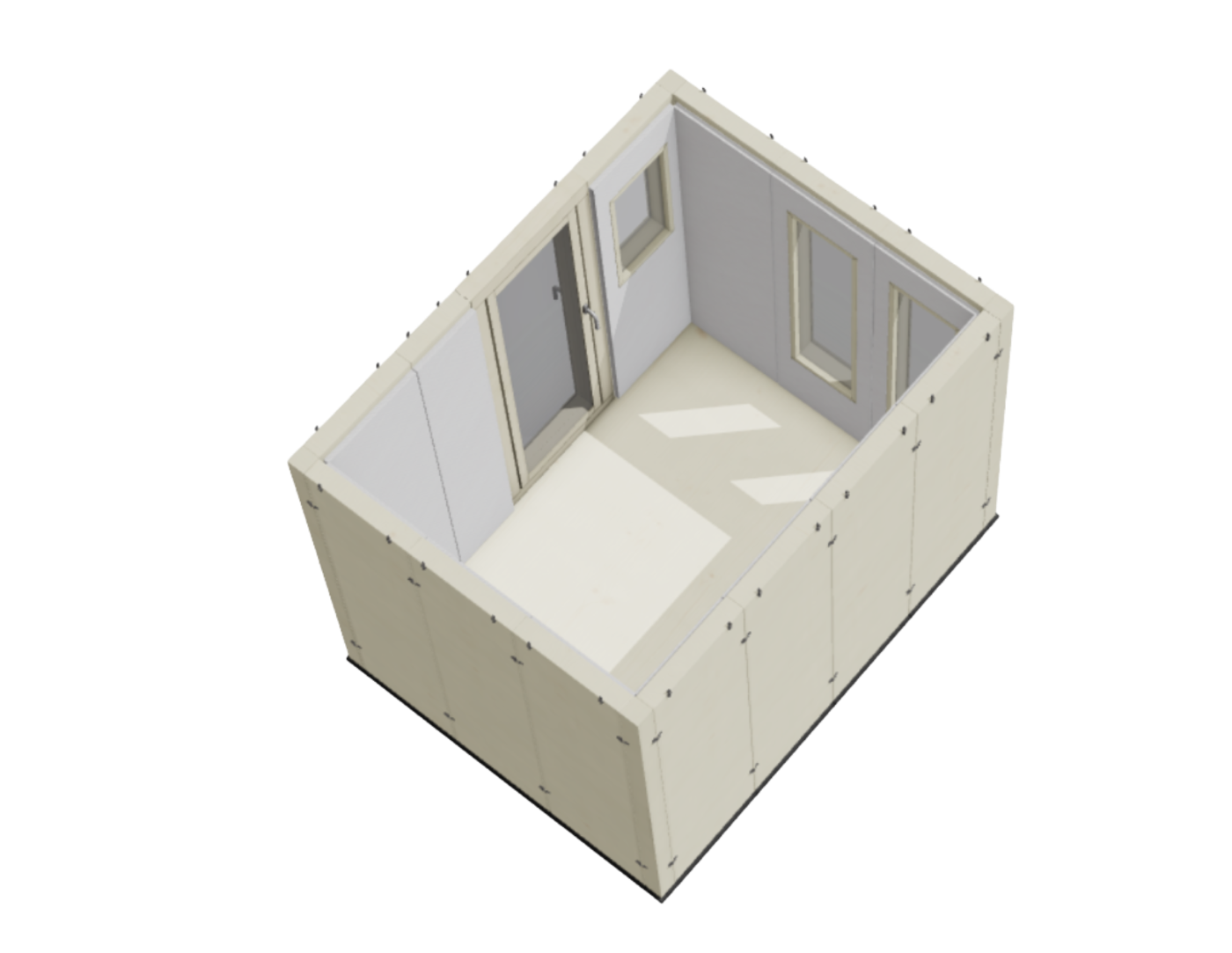 Die Sichtflächen der Innenwände werden mit Akustikstoff und Holz belegt. Die Innenraumakustik der ROSI-Konfiguration wird auf Basis unseres Top-Modells STUDIOBOX PREMIUM erstellt.
